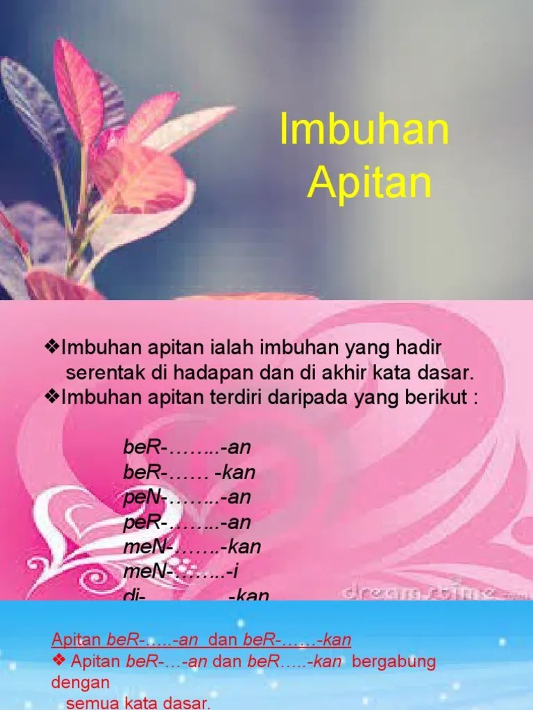 Dec 31, 2016 · kata dasar perkataan yang boleh berdiri sendiri contoh ayat imbuhan apitan. Sebagai bahasa aglutinatif, bahasa melayu boleh menindankan imbuhan pada kata yang sudah berimbuhan, cth: